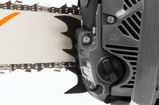 Механизм ленточного тормоза блокирует движение цепи в случае сильной отдачи, что снижает вероятность получения травм оператором.