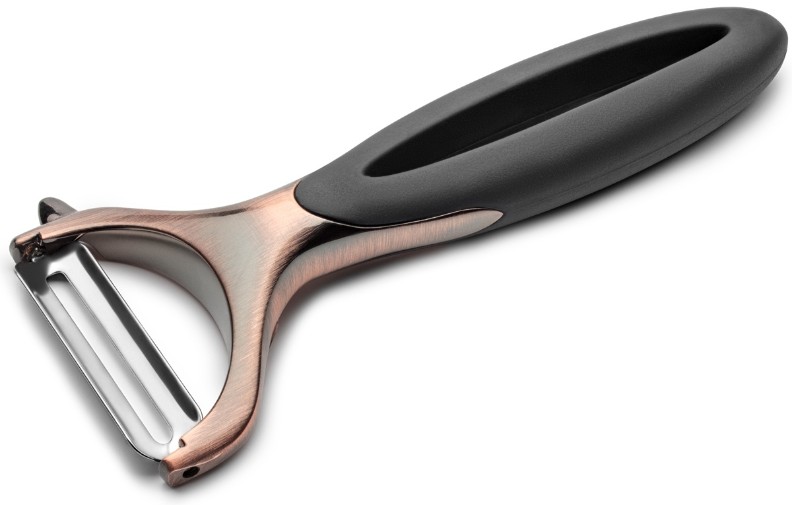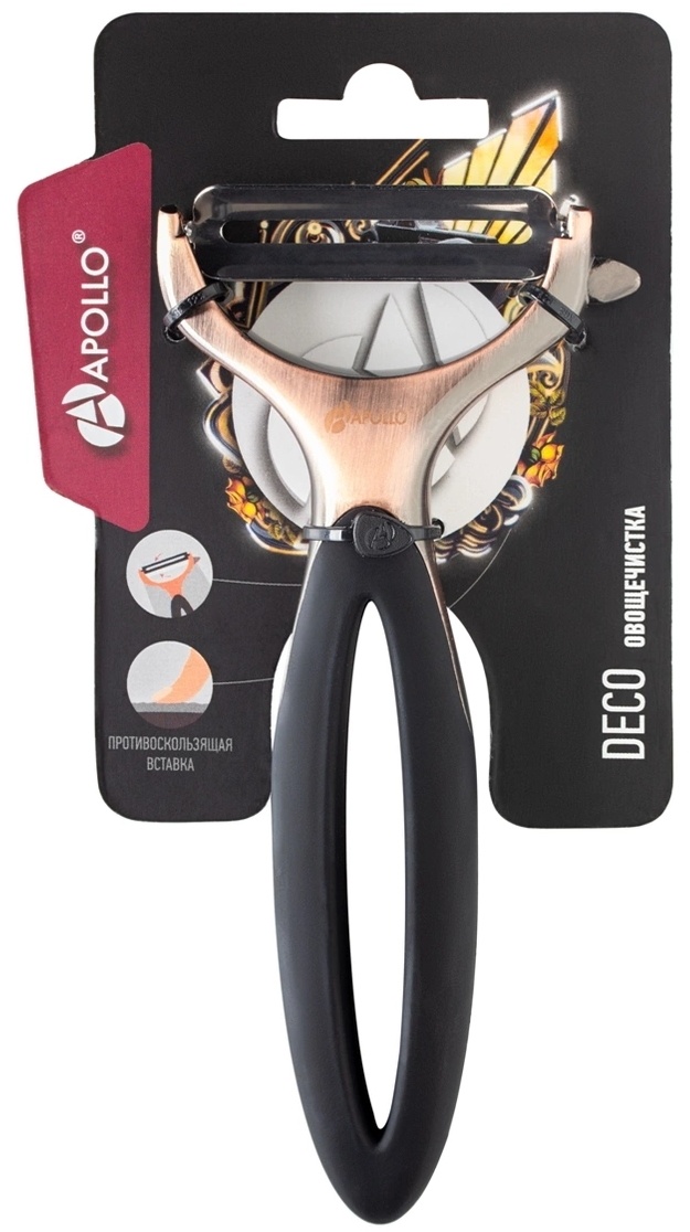 Овощечистка Deco предназначена для аккуратного удаления кожуры с овощей и фруктов. Подвижное лезвие хорошо очищает неровные поверхности любых овощей и фруктов и имеет двустороннюю заточку. Специальная форма рукоятки и её мягкое приятное на ощупь покрытие не позволяют овощечистке выскальзывать из руки во время использования. Материалы изготовления: цинковый сплав с покрытием красной медью, ABS пластик с резиновым покрытием, лезвие нержавеющая сталь 430.