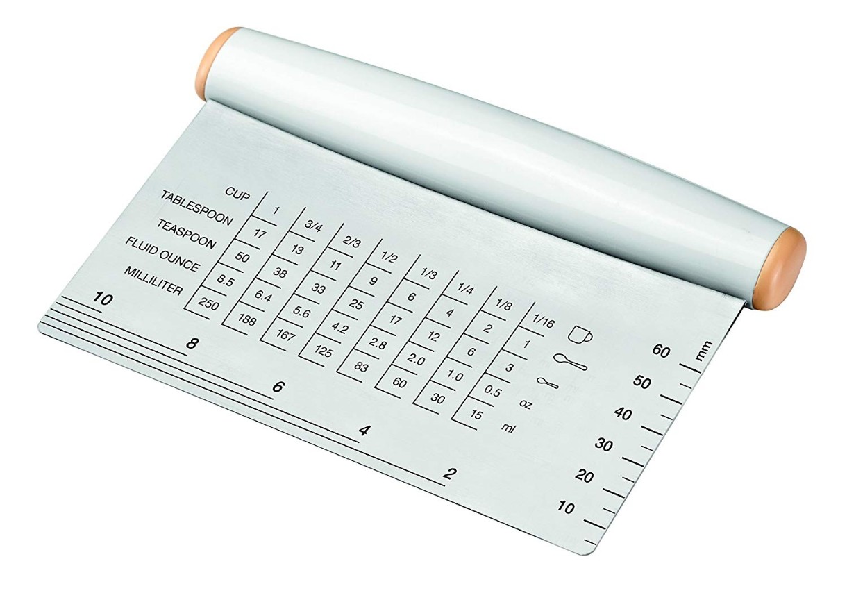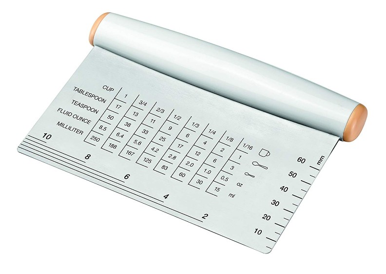 Отлично подходит для легкой и быстрой нарезки теста. Твердое лезвие из нержавеющей стали точно измеряет длину, ширину и толщину. С таблицей для преобразования объема чашки, ложки и чайной ложки в миллилитрах и унциях. Изготовлен из высококачественной нержавеющей стали и прочной пластмассы. Можно мыть в посудомоечной машине.