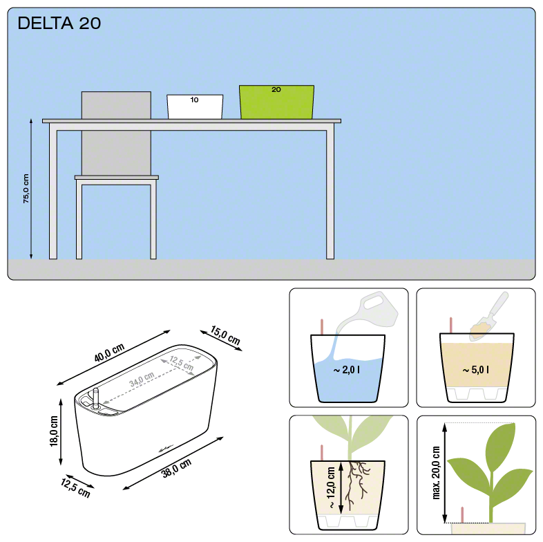 Кашпо Lechuza "Delta", выполненное из высококачественного пластика, имеет уникальную систему автополива, благодаря которой корневая система растения непрерывно снабжается влагой из резервуара. Уровень воды в резервуаре контролируется с помощью специального индикатора. В зависимости от размера кашпо и растения воды хватает на 2-12 недель. Это способствует хорошему росту цветов и предотвращает переувлажнение. В набор входит: Кашпо + внутренний горшок c система автополива. Кашпо Lechuza "Delta" прекрасно впишется в любой интерьер. Оно поможет расставить нужные акценты и придаст помещению вид, соответствующий вашим представлениям.