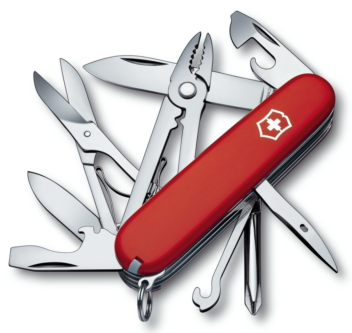 Складной швейцарский нож Victorinox Deluxe Tinker с красной рукоятью содержит 12 элементов, выполняющих 18 функций. Набор функций – 18: - Большой клинок - Малый клинок - Открывалка для консервных банок / плоская отвертка - Открывалка для бутылок / отвертка / паз для снятия изоляции - Ножницы - Плоскогубцы / инструмент для снятия изоляции / инструмент для обжима проводов - Шило / кернер - Крестовая отвертка - Универсальный крючок - Пинцет - Зубочистка - Кольцо для ключей