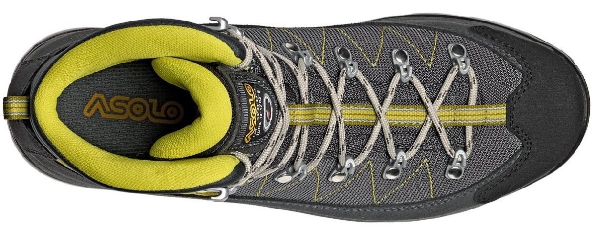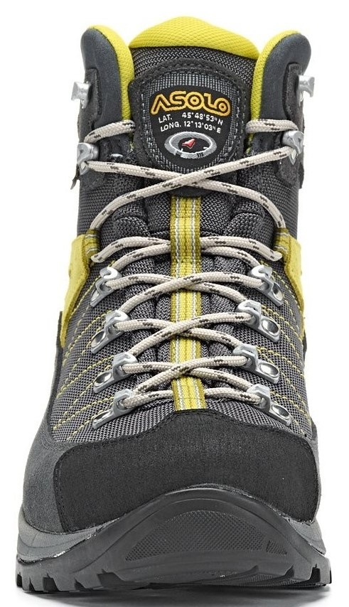 — Верх создан комбинированием натуральной водостойкой замши 1.6-1.8 мм с прочным нейлоновым материалом Cordura. — Паропроницаемая мембрана Gore-Tex Extended Comfort. — Подошва базируется на промежуточном слое серии Asolo Radiant, который состоит из двух полноразмерных слоёв EVA-пенки средней и низкой плотности, что существенно увеличивает комфорт и снижает частично общий вес. — Подошву формирует подмётка Vibram из цепкого термополиуретанового материала MegaGrip.