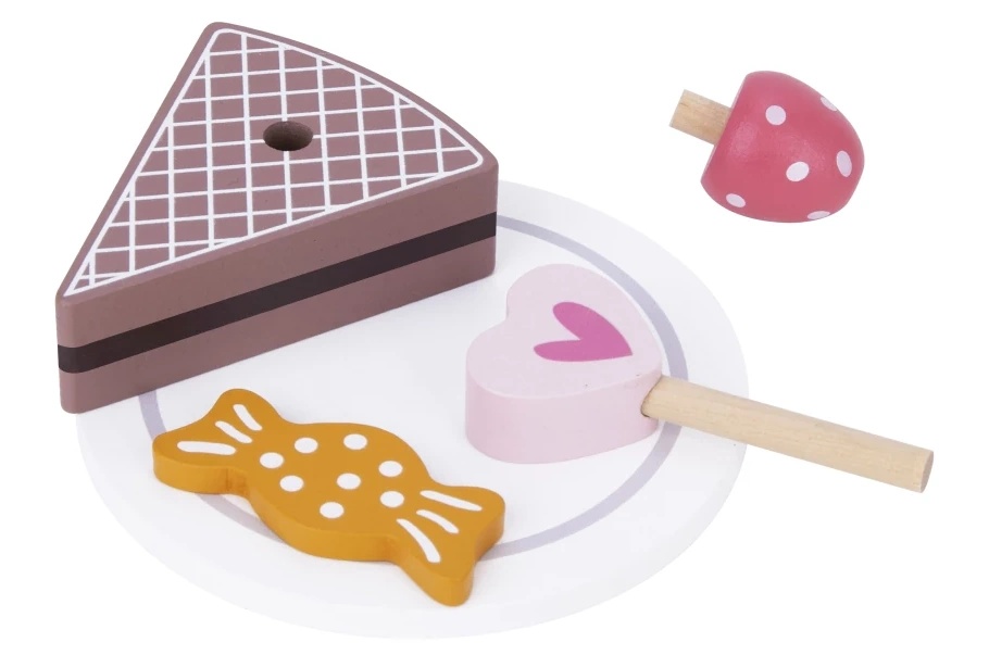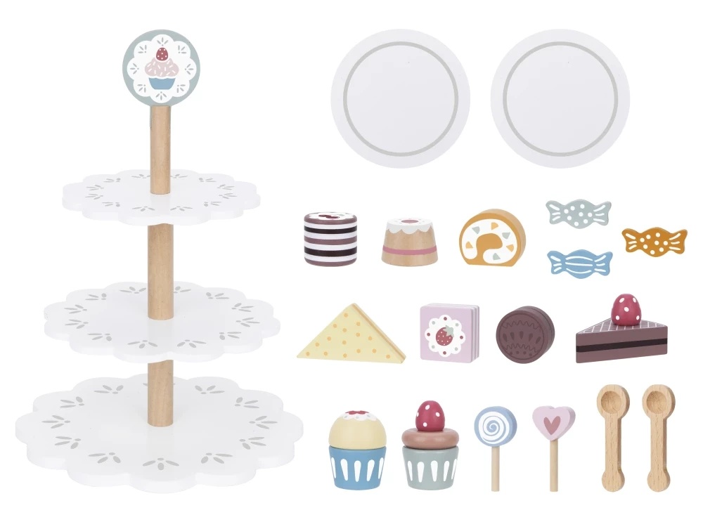 Неповторимый деревянный поднос для сервировки десертов Tooky Toy для детей — отличная игрушка для ролевых игр как для взрослых, так и для профессионалов. Прочная трехъярусная тумба (31 х 22 см) станет прекрасным дополнением детской комнаты и детской кухни. Помимо подставки внутри упаковки дети найдут еще 18 штук деревянных пирожных и другие аксессуары для сервировки. Также есть ложки и тарелки для сервировки.