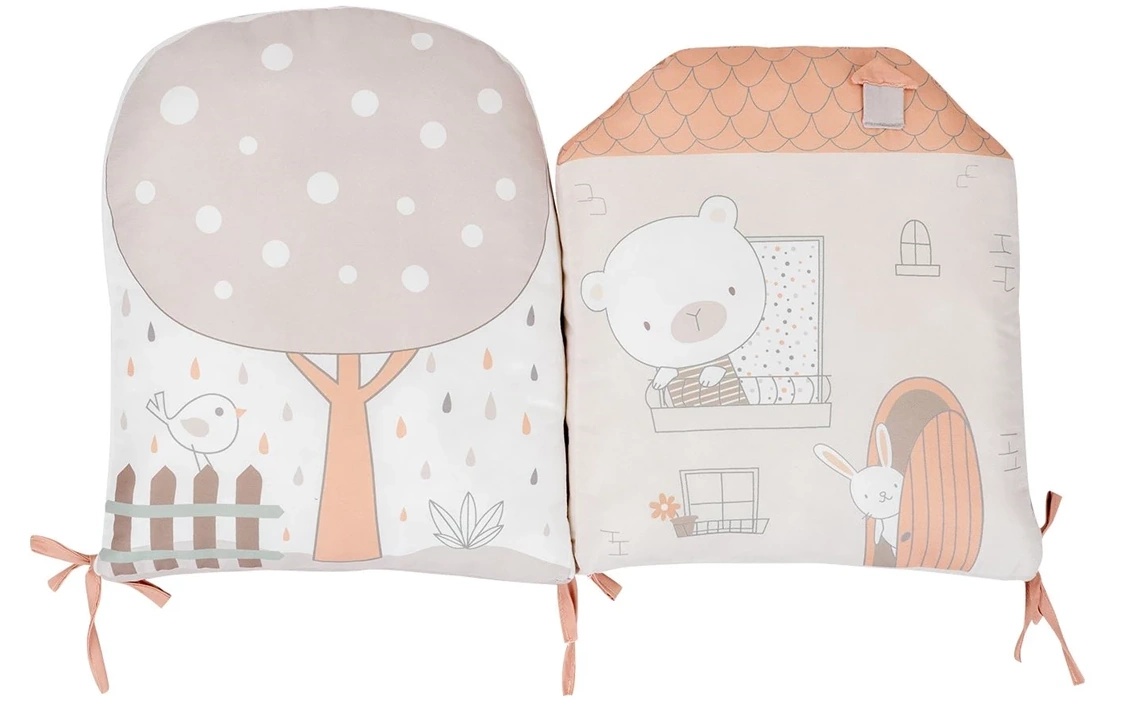 Завязки, прикрепленные к каждой подушке, обеспечивают легкое крепление к кроватке.