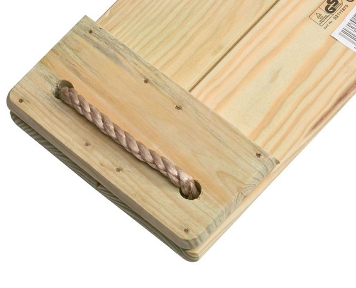 Материалы: сидение из пропитанной защитным раствором древесины. Сиденье собрано с помощью саморезов из нержавеющей стали и веревки PP Ø10мм собрана на скобах. Кольца и восьмерки выполнены из гальванизированной стали. Страховочные узлы на веревке изготовлены из черного пластика.