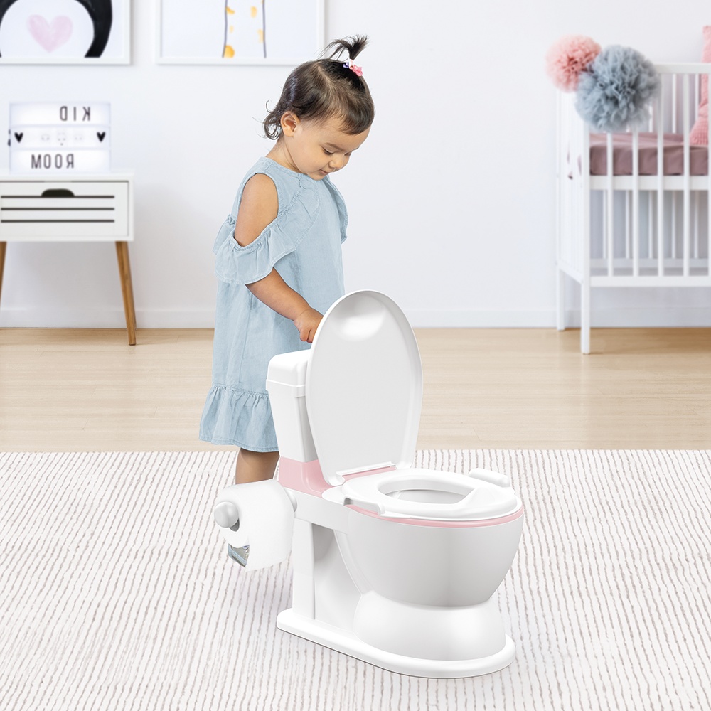 Реалистичность и удобство: Горшок-унитаз оборудован держателем для туалетной бумаги, а также имеет кнопку слива воды (имитирующий звук, элементы питания в наборе). Чаша в горшке съемная, что позволяет легко ухаживать за ним. Обучающая функция: Одной из главных функций детских учебных унитазов является обучение детей пользоваться унитазом и развитие навыков гигиены.