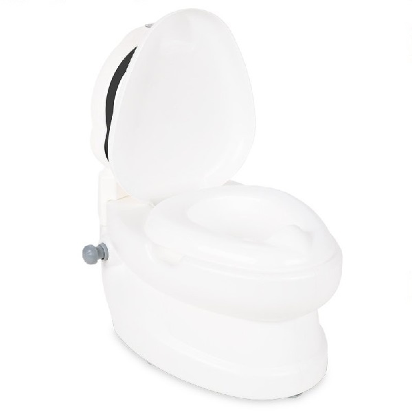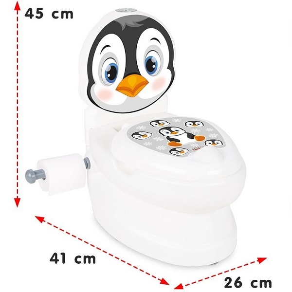 Горшок выполнен в форме туалета и имеет анатомическую форму, которая обеспечит малышу комфорт и удобство, а родителю быструю уборку и чистку. Горшок оборудован съёмной спинкой, которая имеет фигурную форму и яркую наклейку с изображением панды. Слив имитирует встроенная кнопка с эффектами, она воспроизводит реалистичный шум воды и подсвечивается разными цветами во время активации.