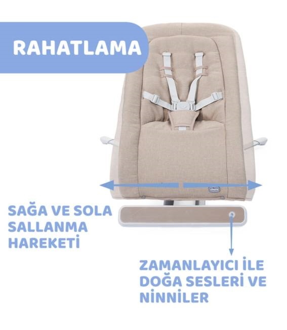 Новый шезлонг Rhythm’n’Sound от Chicco - идеальное место для отдыха вашего ребенка. Наклоняемая в двух положениях спинка всегда обеспечивает оптимальный комфорт. Звуки природы и спокойные мелодии развлекают вашего ребенка, когда он лежит на качелях. Чтобы успокоить малыша, можно активировать функцию качания в стороны. Она работает с использованием соединительного кабеля USB и внешнего блока питания (не входит в комплект). В качестве альтернативы функция качания также работает от батарей (4 x AA, 1,5 В - не входят в комплект).