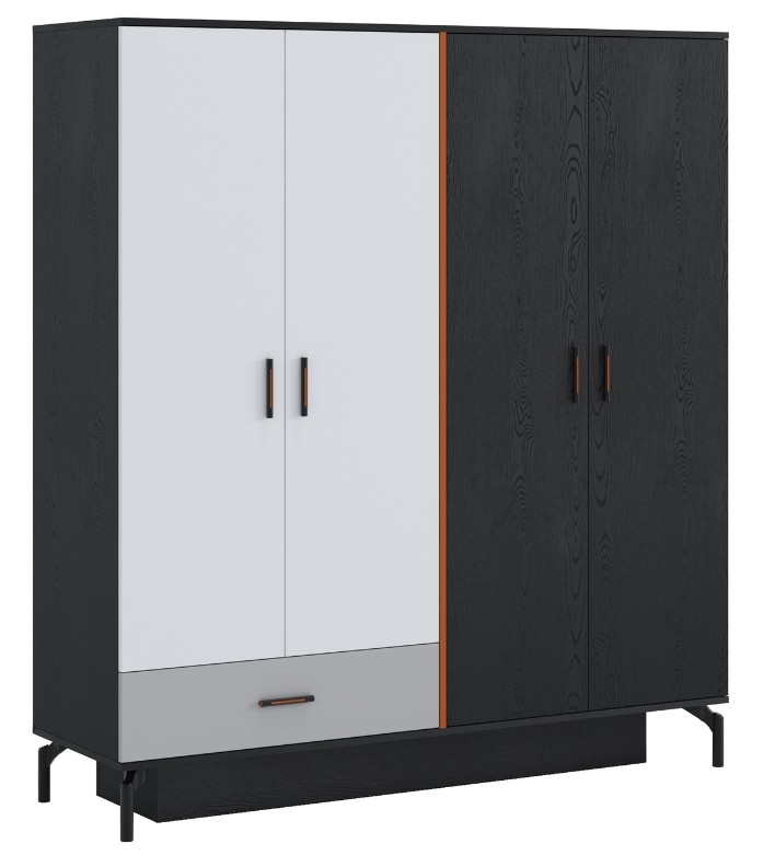 Шкаф-купе TREND от Newjoy выполнен в современном стиле в черном, сером и белом цветах с акцентами оранжевого цвета. Он предлагает достаточно места для вашей одежды благодаря семи полкам, ящику и платяной штанге. Практичные аксессуары включают органайзер и держатель для ручек, расположенные внутри шкафа. Ящик имеет прямой доступ снаружи и состоит из трех отделений. Для большей устойчивости ножки изготовлены из АБС-пластика.