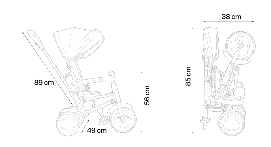 Qplay Rito+ развивается по мере роста потребностей ребенка. Оснащенный двумя комплектами подставок для ног, трехколесный велосипед можно использовать с 12-месячного возраста благодаря подставке для ног для младенцев, обеспечивающей удобное и безопасное положение. По мере того, как ребенок проходит другие этапы роста, трехколесный велосипед меняется путем удаления таких компонентов, как защитное кольцо, навес, опоры для ног. Складываясь менее чем за 15 секунд, трехколесный велосипед становится достаточно компактным, чтобы его можно было перевозить куда угодно или хранить в доме, не занимая слишком много места.