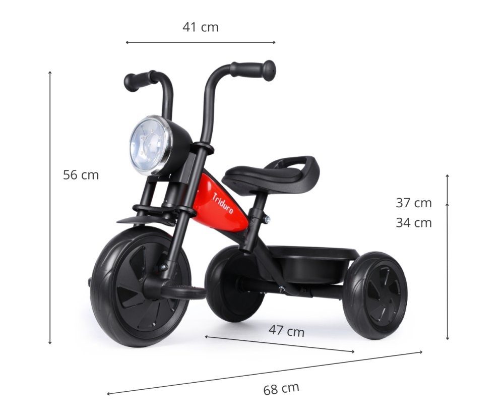 Трехколесный велосипед Triduro внешне напоминает мотоцикл и имеет уникальную раму, имитирующую топливные баки настоящего мотоцикла. Эргономичный дизайн, прочная металлическая рама и резиновые накладки на руле обеспечивают надежный захват во время игры. Руль велосипеда имеет форму мотоцикла, что добавляет характера и стимулирует воображение ребенка. Лампа Тридуро светится 7 светодиодами, которые включаются с помощью кнопки на корпусе лампы.