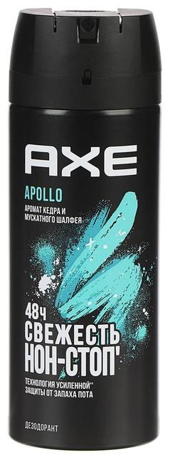 Дезодорант-аэрозоль AXE Apollo. Аромат, сочетающий в себе свежие ноты мандарина, сандалового дерева и полыни. Не оставляет следов и пятен на одежде и не блокирует потовые железы, придавая уверенность в себе на весь день, каждый день и в любой ситуации. Стань героем в ее глазах с AXE APOLLO!