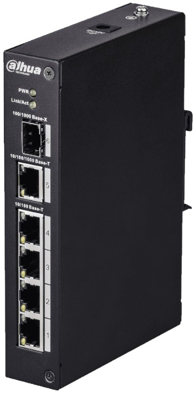 — Неуправляемый Fast Ethernet коммутатор Dahua DH-PFS3106-4T укомплектован самонастраива-ющимися портами, передающими сигнал по витой паре: 4×10/100M порта RJ-45, одним 10/100/1000M портом RJ-45 и одним с SPF-портом. Все порты адаптируются к режиму MDI/MDIX автоматически. Модель готова к эксплуатации на улице круглый год (установка в шкаф или коробку с защитой IP66): диапазон рабочих температур — −40 ºС...+70 ºС, предусмотрена грозозащита.