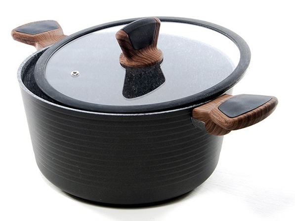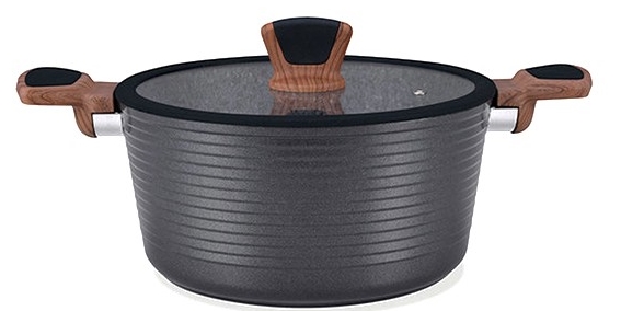 Новая касрюля Diamond Grey от компании Fissman изготовлена из литого алюминия с новым 5-ти слойным профессиональным покрытием EcoStone. Это устойчивое к царапинам и износу покрытие, усиленное вкраплениями каменных частиц. Усовершенствованная технология обеспечивает наилучшие эксплутационные свойства, прочность и долговечность. Толстое дно кастрюли рационально распределяет тепло, а удобные ручки из бакелита не нагреваются и не скользят в руках. Плотно прилегающая крышка надежно сохранит тепло внутри кастрюли. Уникальный, притягивающий дизайн серии Diamond Grey не оставит Вас равнодушными.