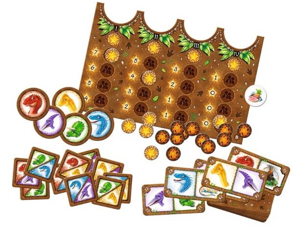 Комплектациядвустороннее игровое поле, 60 данозавров, 3 стартовые карты, 5 жетонов динозавров основного варианта, 10 жетонов динозавров с расширенными вариантами, 18 маркеров лавы, 1 маркер деликатеса, инструкция