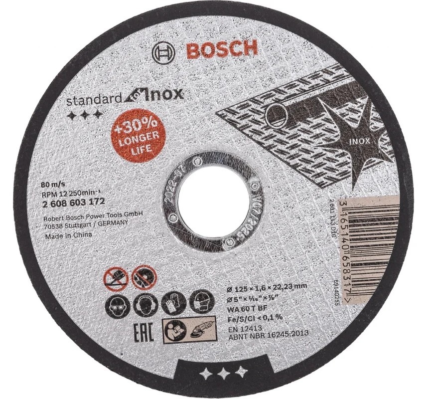 Диск абразивный Bosch Standard INOX 125x1.6х22.2 (2608603172) - это прямой диск, который гарантирует ровный рез, не оставляя на материале заусенцев. Предназначен для резки любых металлических деталей и конструкций в том числе из нержавеющей стали. Это способствует качественному выполнению отрезных работ.
