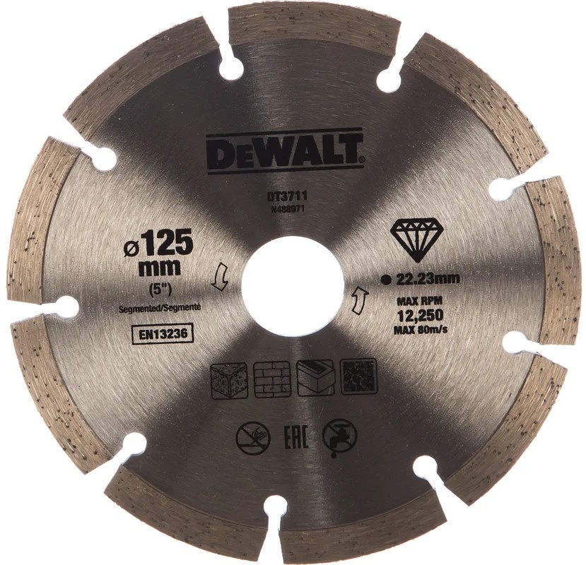 Алмазный сегментированный диск DТ 3711 используется совместно с угловыми шлифовальными машинами для работ по основным строительным материалам. Это синтерированные диски, предназначенные для сухого реза. Благодаря сегментной кромке скорость реза высока.