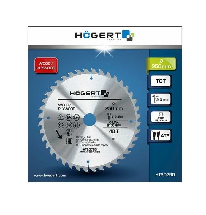 Диск пильный по дереву 250x30 мм, 40Т, mn65 HOEGERT TECHNIK HT6D790 характеризуется высокой устойчивостью к температуре и деформации. Подходит для резки различных материалов из цельной древесины и древесных материалов, таких как ДСП, ДВП и фанера.