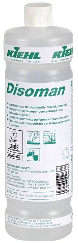 Высокоэффективное высококонцентрированное жидкое средство, с нейтральным водородным показателем, применяется для ручного мытья посуды и кухонного инвентаря. Продукт эффективно растворяет жировые загрязнения и щадяще очищает посуду от различных видов загрязнений. Не содержит красящих и ароматических веществ, отвечает основным требованиям предъявляемых на предприятиях по производству и переработке продуктов питания, расходуется экономно, доходный. Состав продукта Disoman направлен на сохранение качества окружающей среды и разрешает присвоение ему «Экологического знака Соответствия» Европейского Союза.