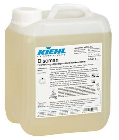 Высокоэффективное высококонцентрированное жидкое средство, с нейтральным водородным показателем, применяется для ручного мытья посуды и кухонного инвентаря. Продукт эффективно растворяет жировые загрязнения и щадяще очищает посуду от различных видов загрязнений. Не содержит красящих и ароматических веществ, отвечает основным требованиям предъявляемых на предприятиях по производству и переработке продуктов питания, расходуется экономно, доходный. Состав продукта Disoman направлен на сохранение качества окружающей среды и разрешает присвоение ему «Экологического знака Соответствия» Европейского Союза.