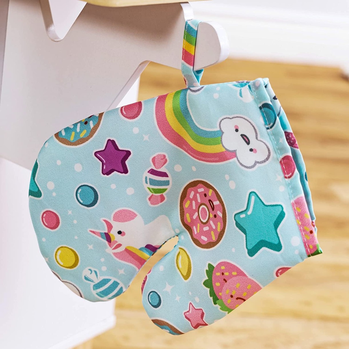 Контейнер для хранения и рукавица с принтом для дополнительной игры. У всех кухонных принадлежностей есть свой неповторимый облик. Поднос для выпечки с 6 печеньями трех форм: звезды, цветы и единороги. Включает миску, пакет молока, скалку и две лопатки.