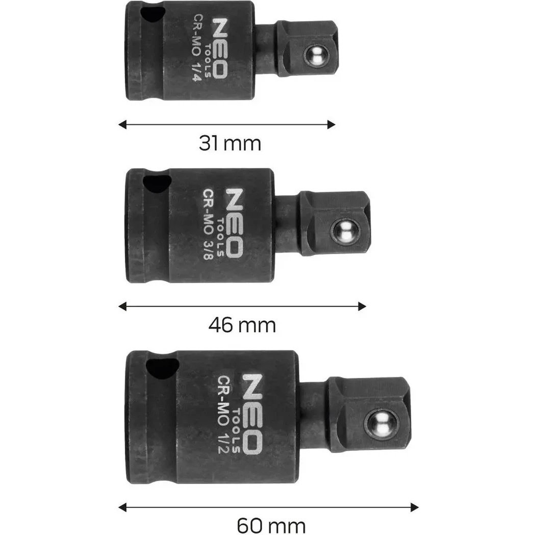 Набор ударных шарниров 3 штуки 1/2", 1/4", 3/8" 10-256 от NEO, которые предназначены для инструментов с ударным механизмом. Изготовлен из хромомолибденовой стали - устойчив к коррозии, растяжению и высоким температурам. Шарниры обеспечивают защиту от нежелательного выскальзывания штифта из гнезда. Они предлагаются в размерах 1/2", 1/4", 3/8". Марка NEO отвечает требованиям профессионалов.