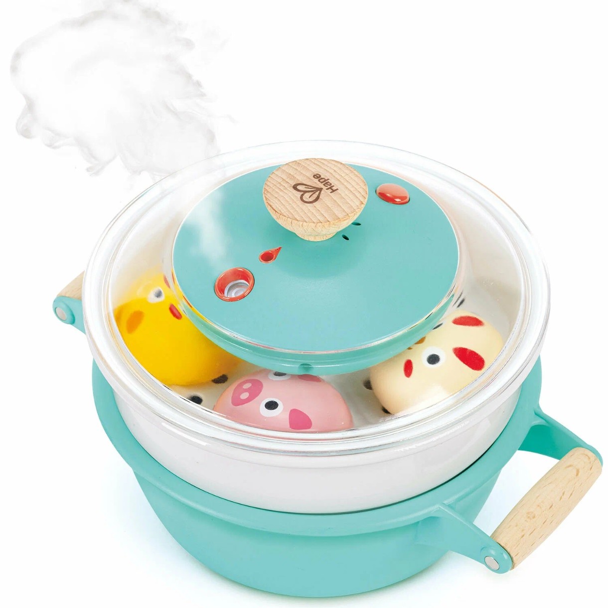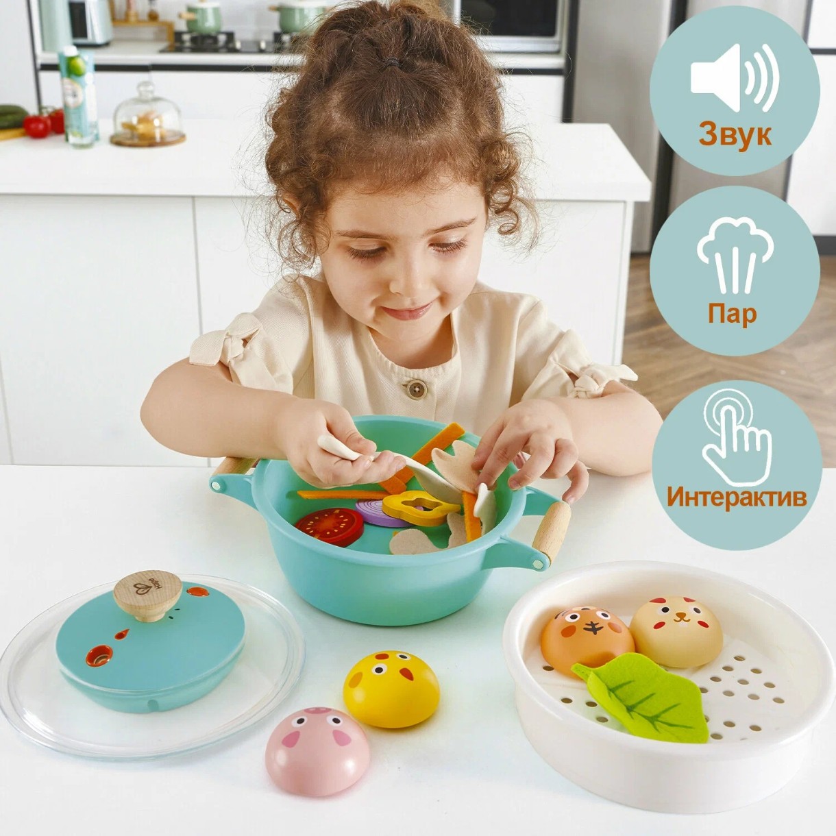 Положите еду в кастрюлю, перемешайте ложкой или поместите корзинку с булочками для пара. Затем закройте крышку, нажмите кнопку и услышите звуки готовки! Добавьте несколько капель воды, и через 10-15 секунд из кастрюли поднимется прохладный пар, как настоящий!