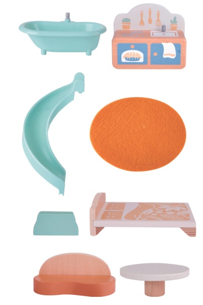 Двухуровневый дом укомплектован полным набором мебели и аксессуаров – две фигурки тигров, кровать, ванна, коврик для ванной, диван, журнальный столик, кастрюля, две тарелки, две чашки, плита, горка и 18 карточек с изображением мусора для 3 сортировочных баков.
