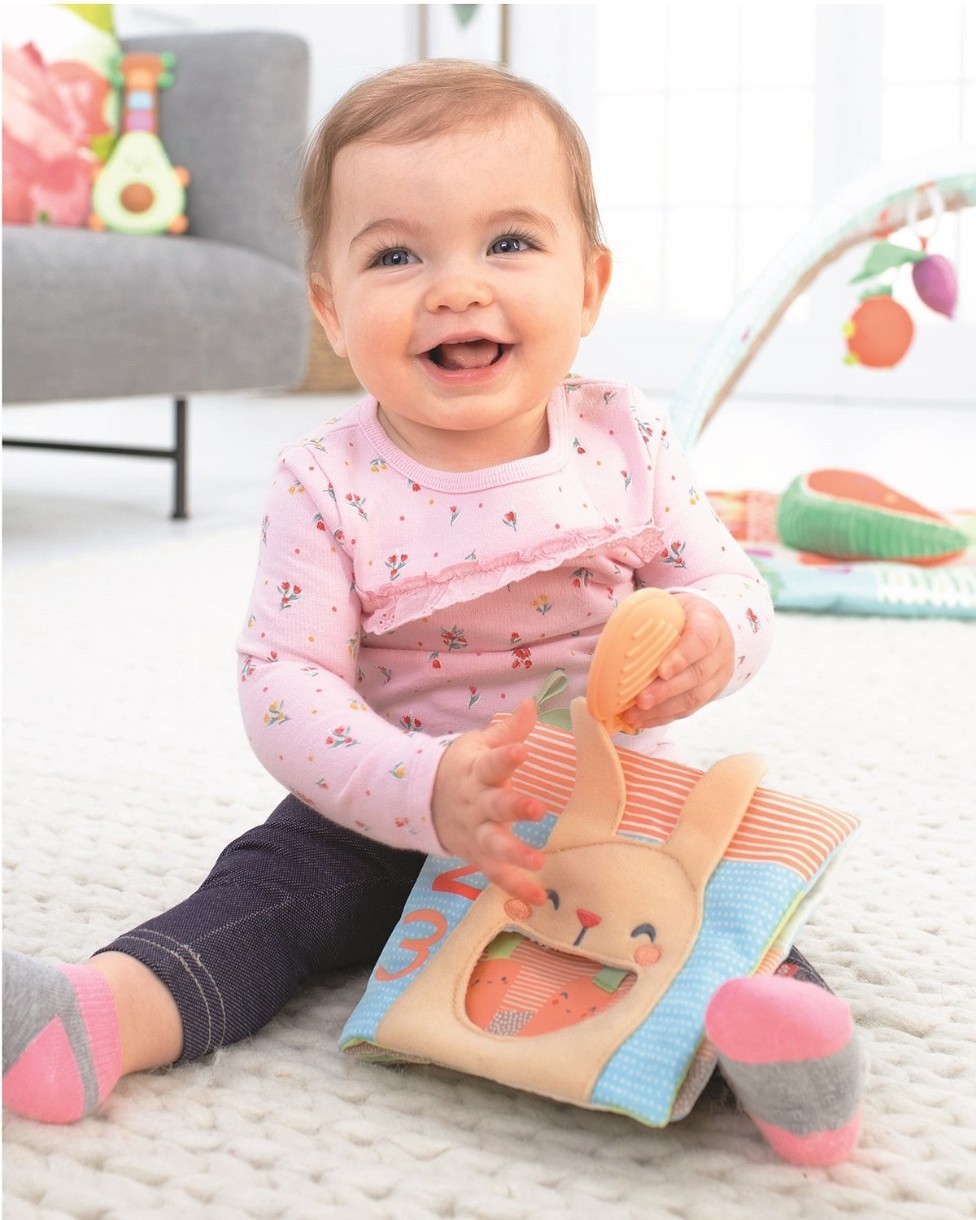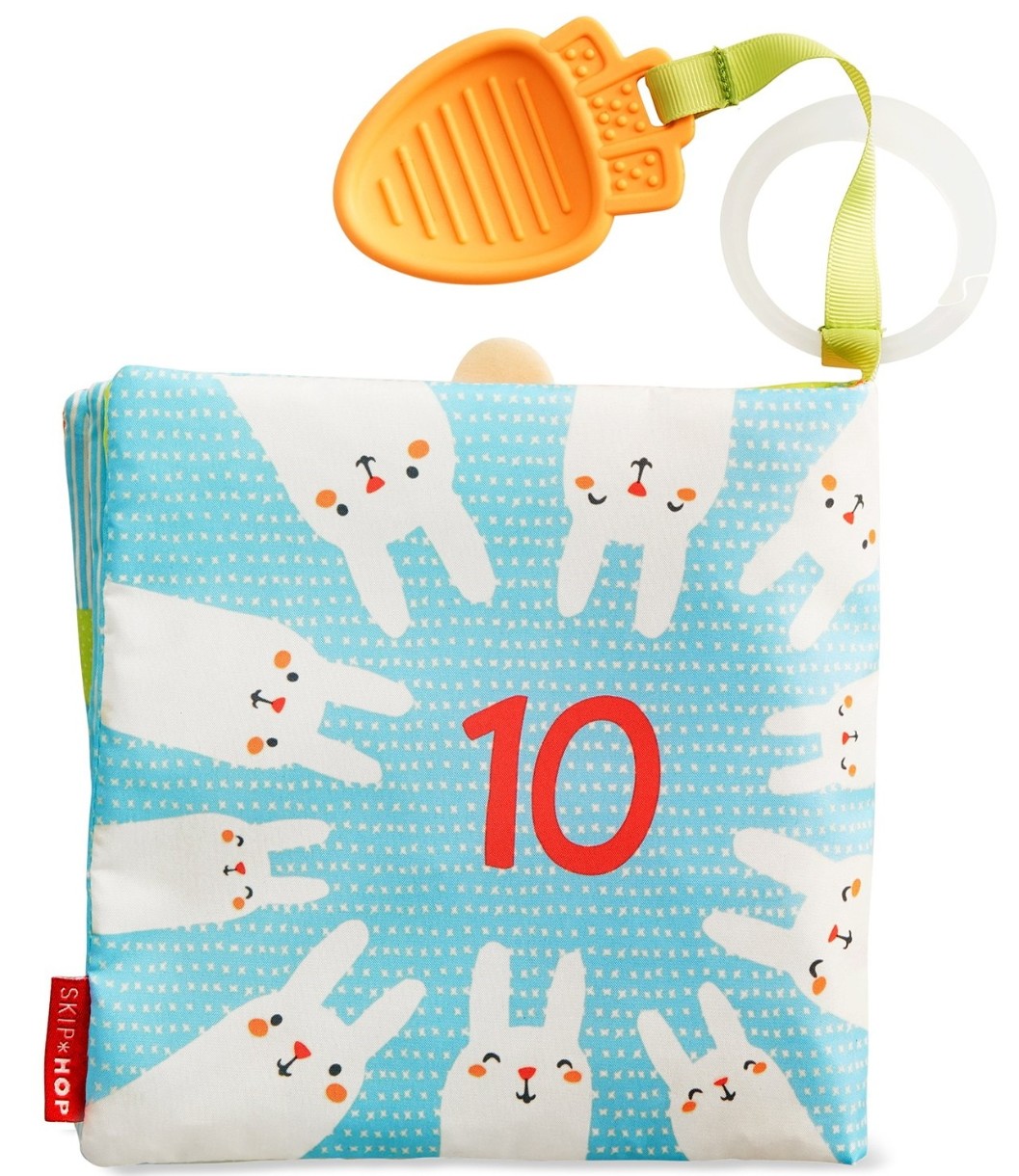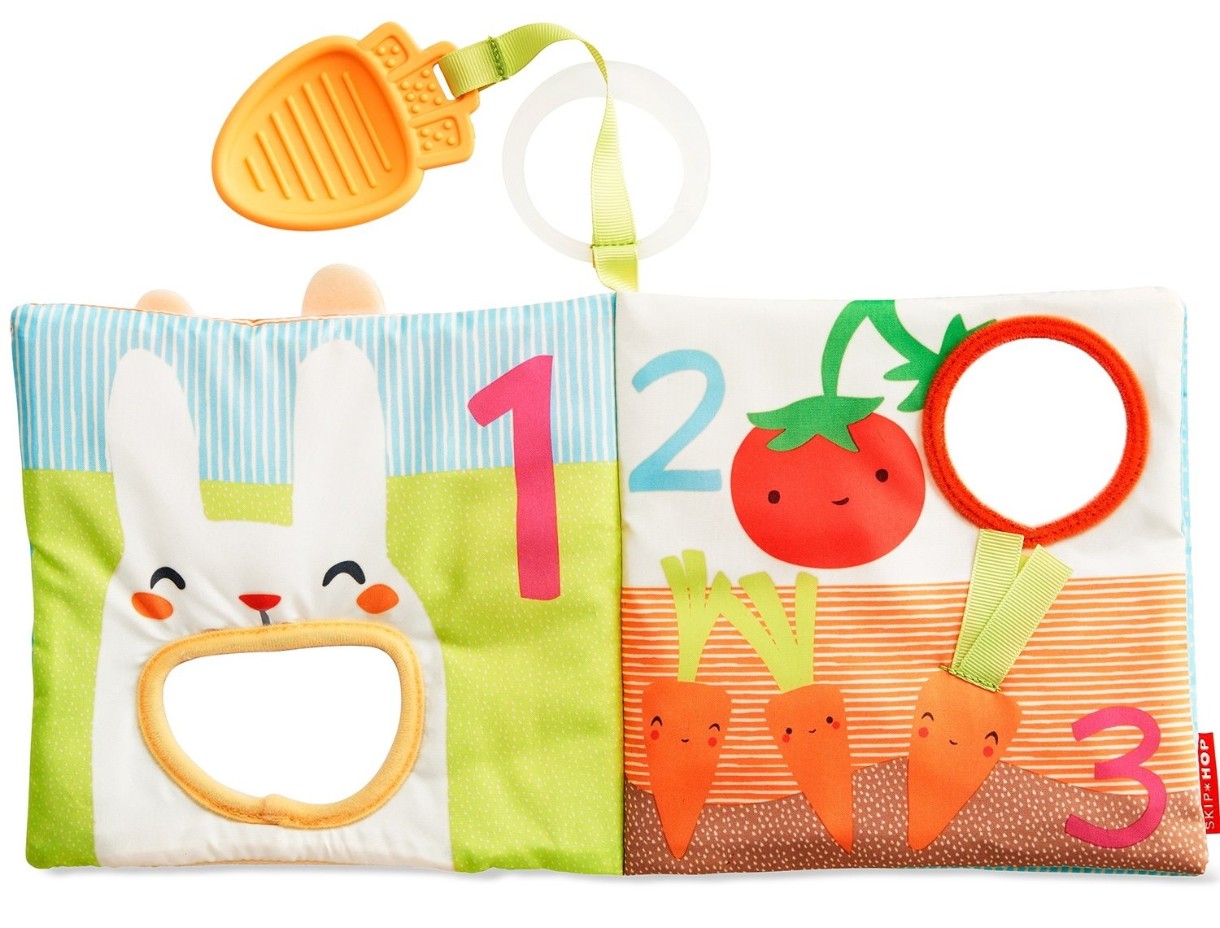 Эта милая интерактивная книга, наполненная увлекательными занятиями для ребенка, включает мягкие страницы со звуками шуршания, детское зеркальце, красочные цифры, животных и рисунки сада. Вставьте и вытащите морковный прорезыватель из отверстия для игры в прятки.