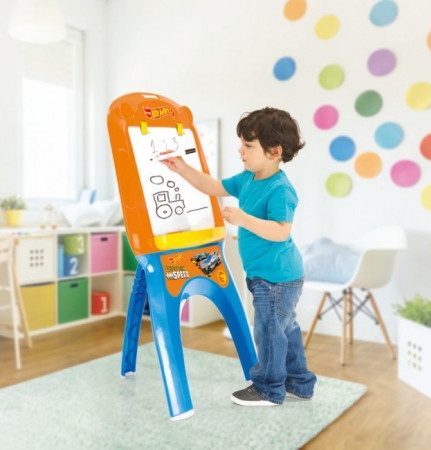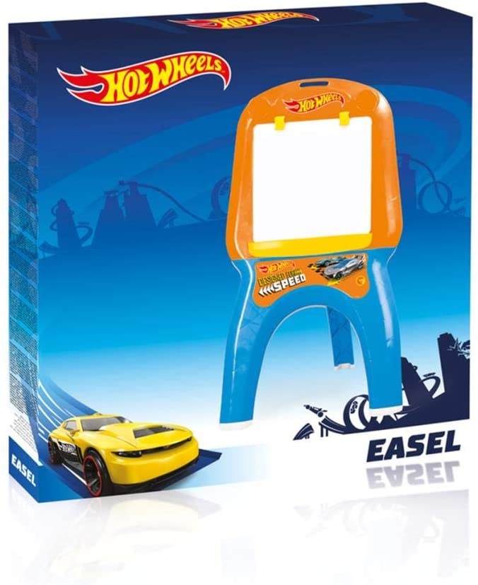 Детский мольберт для творчества Hot Wheels: яркий красочный дизайн, два клипа для крепления бумаги, легкая в сборке, место для хранения карандашей и мелков, можно использовать как магнитную доску или как доску для рисования, аксессуары: маркер, стирательная резинка, 10 раскрасок, стикеры.