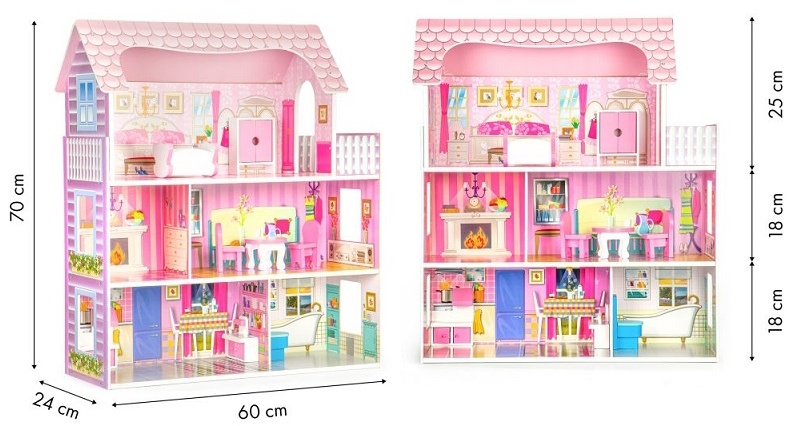 На первом этаже находятся ванная комната и кухня. На первом этаже находится большая гостиная с двумя стульями и столом и небольшая комната для обустройства. На верхнем этаже вы найдете спальни для куклы с выходом на террасу. Такое расположение комнат дает неограниченные возможности для веселья. Присоединяйтесь к веселью вместе с ребенком и узнайте!