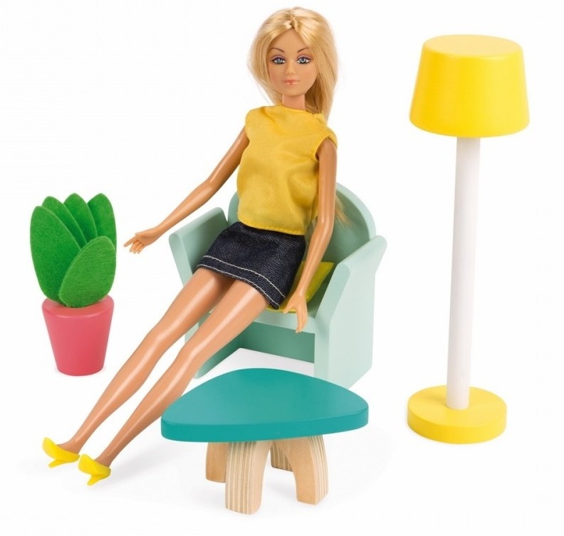 Состав набора: деревянный сборный дом, кровать, раковина с зеркалом, туалетный столик с зеркалом, пуф, кухня, большой стол, 2 стула, маленький столик, кресло, торшер, растение в горшочке.