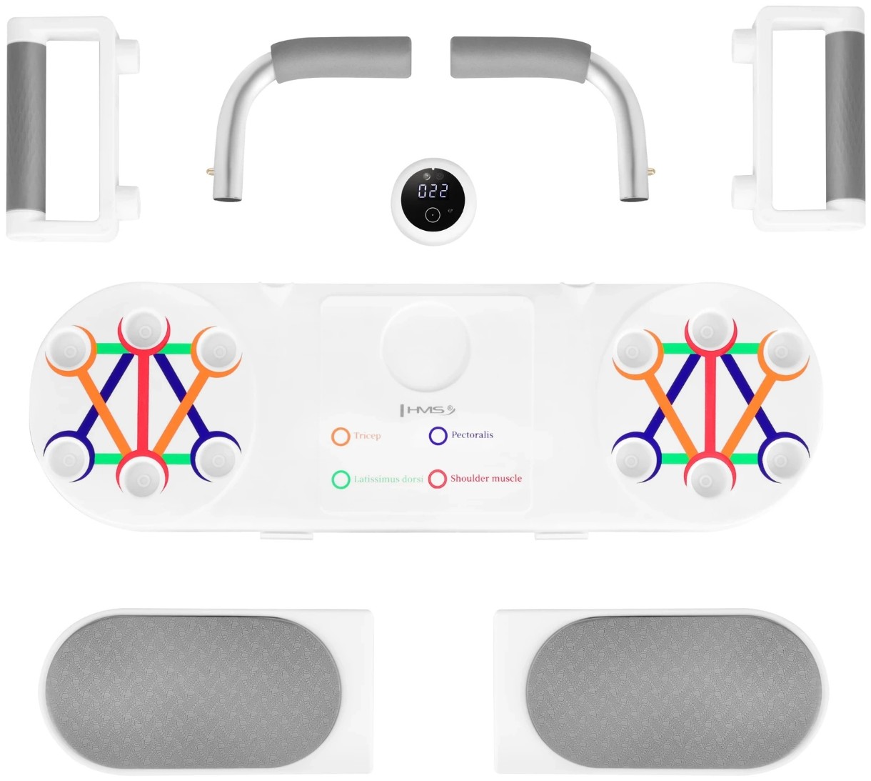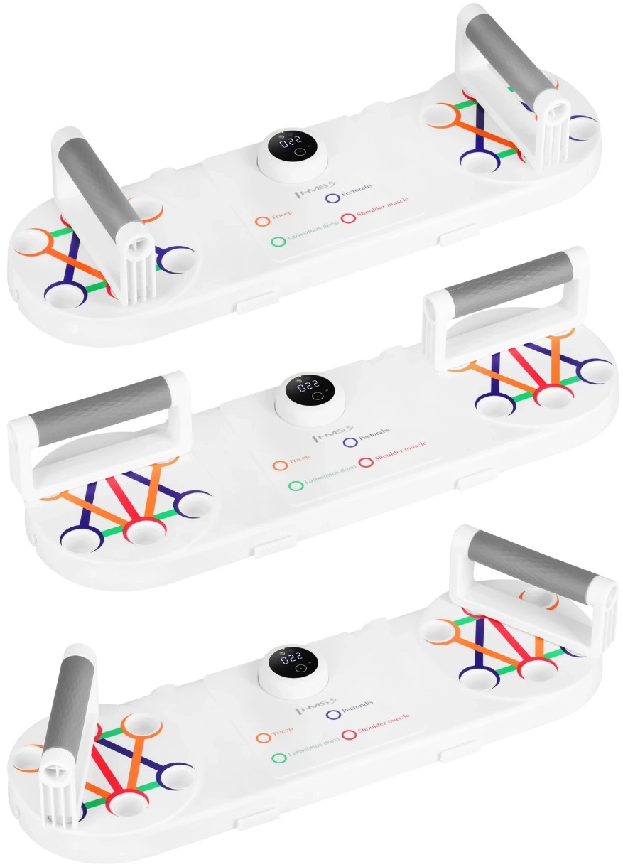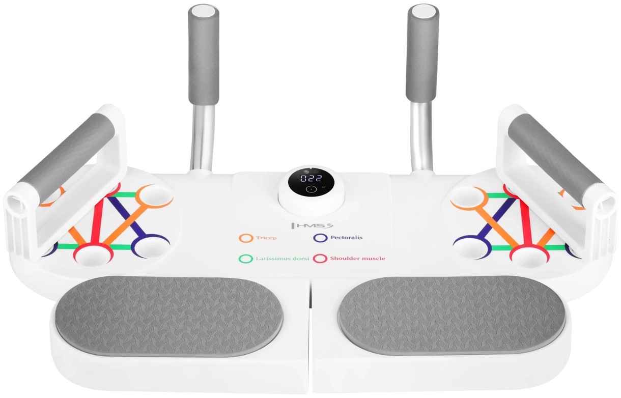 Также есть встроенный интеллектуальный счётчик повторений с оптическим (IR) датчиком, который автоматически считает отжимания.Платформа имеет противоскользящее покрытие и мягкие подкладки для комфортной опоры локтей и рук.