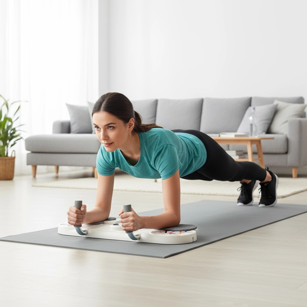Конструкция 3 в 1 позволяет выполнять отжимания, упражнения на пресс и планку, а также использовать резиновые эспандеры (в зависимости от комплектации). Доска компактная, удобна для домашнего использования и рассчитана на нагрузку до 150 кг.