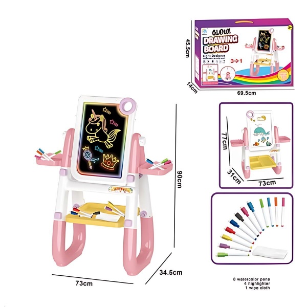 Эта многофункциональная доска для рисования — идеальный инструмент для юных художников и любителей творчества. Доска выполнена в виде двустороннего мольберта и может использоваться как для рисования маркерами, так и для создания светящихся флуоресцентных рисунков. Легкая и прочная, она идеально подходит для использования дома, в школе или на занятиях в студиях.