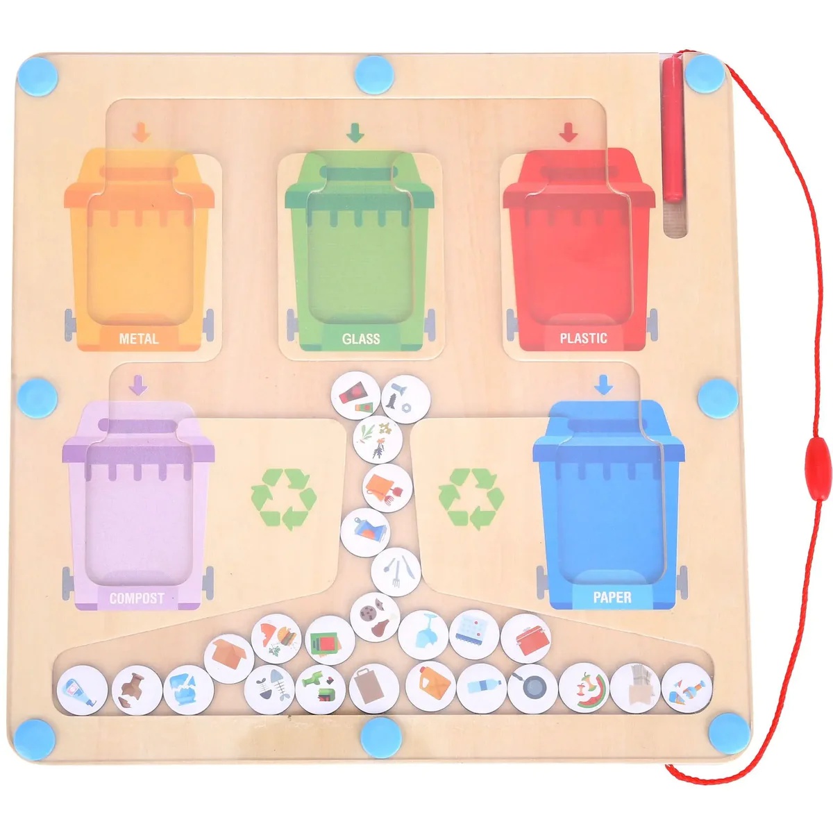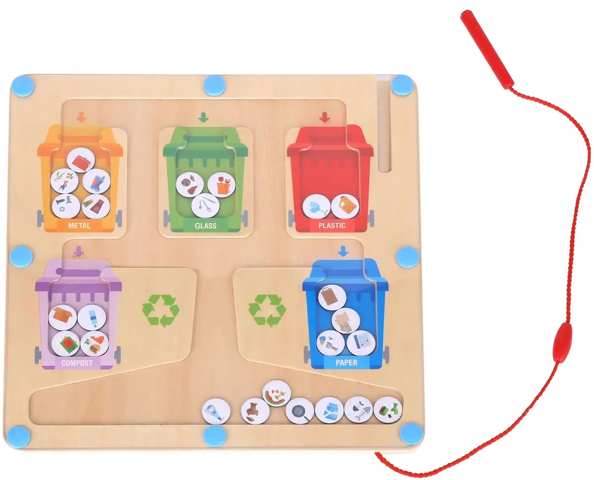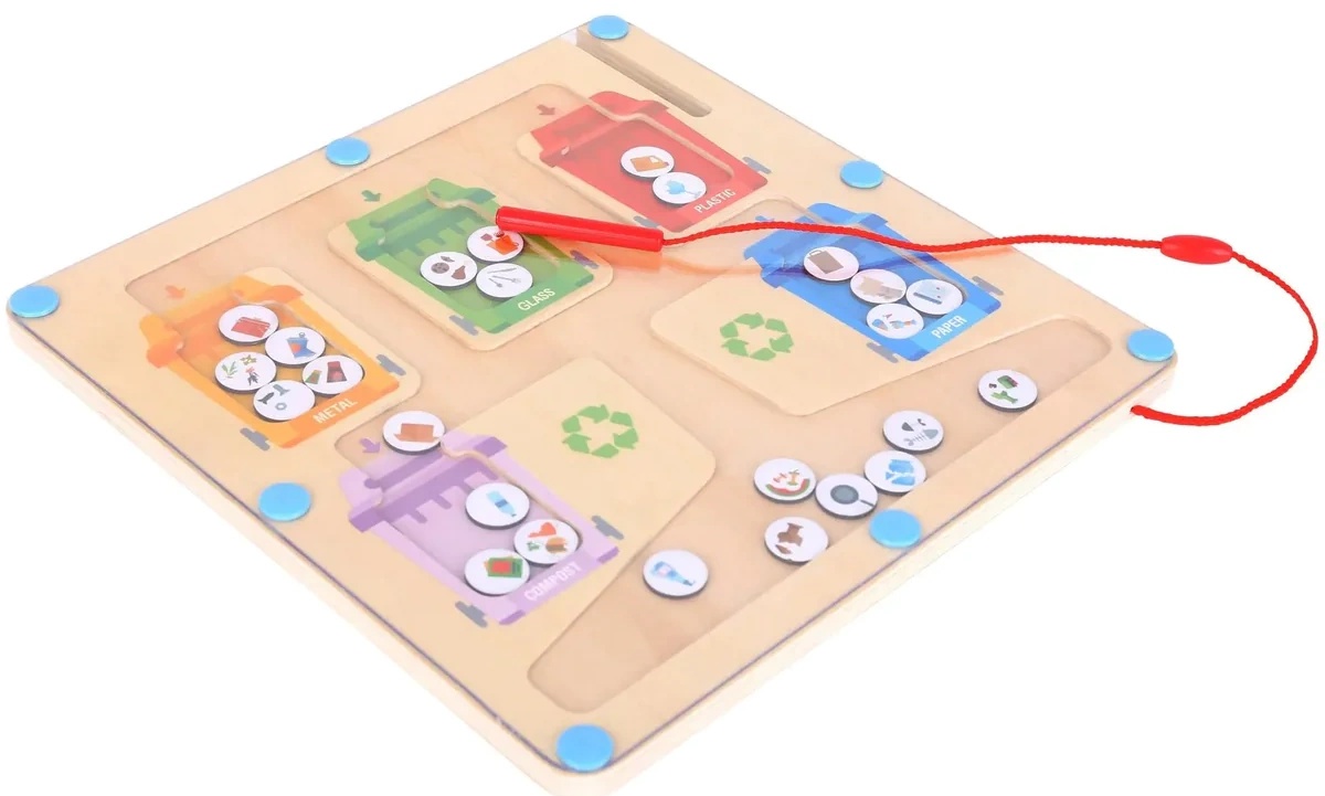 Интересный способ узнать о переработке отходов — пройти через лабиринт для переработки деревянных игрушек Tooky Toy! Узнайте, какие предметы отправляются в какую корзину, а какие не подлежат переработке! Куда идут рыбные кости? В какую корзину ты кладешь огрызок яблока?