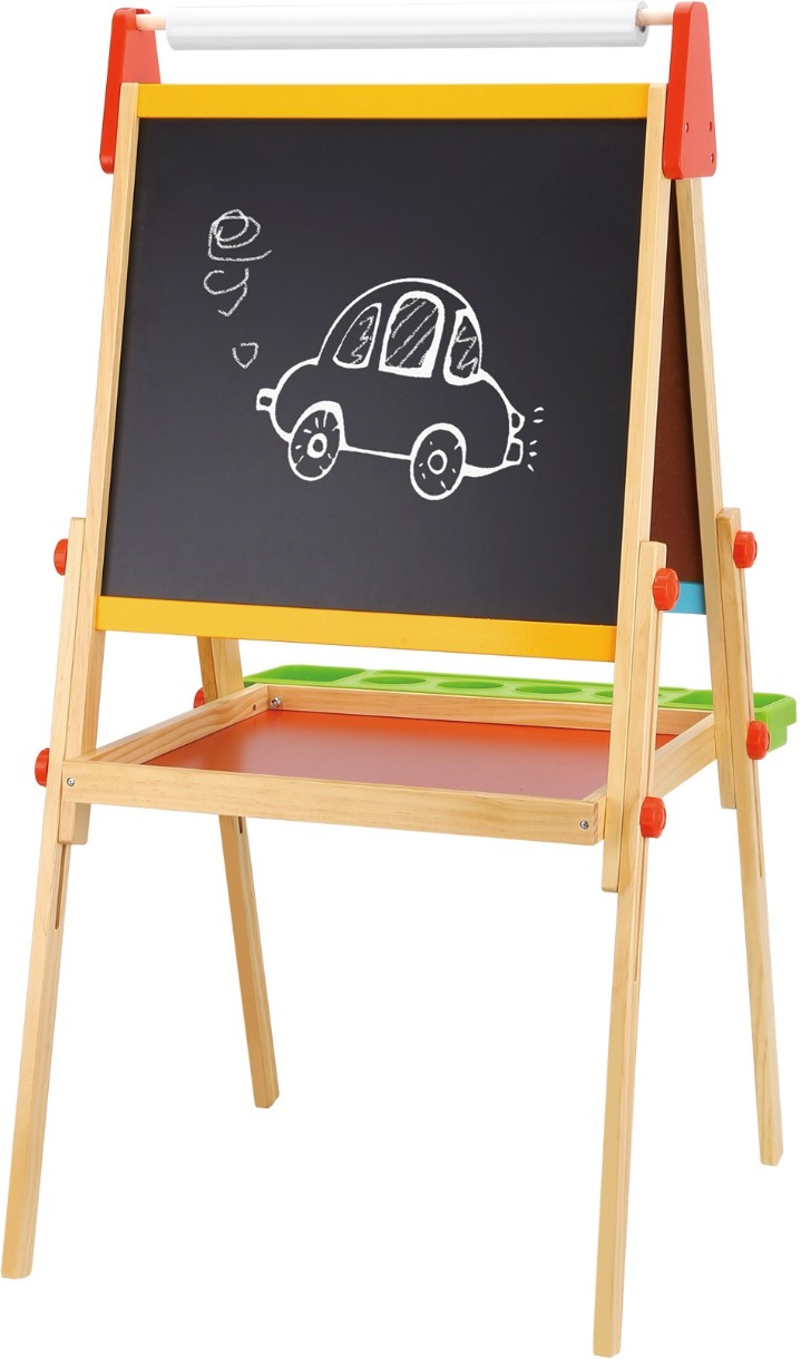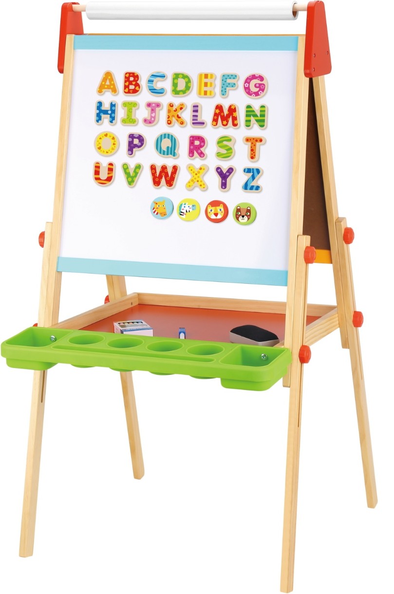 Красочный мольберт от Tooky Toy станет отличным помощником в развитии творческих способностей Ваших детей. С его помощью можно превратить комнату в художественную мастерскую. На одной стороне мольберта можно рисовать мелками, а на другой - фломастерами. Помимо этого белая сторона является магнитной. Внизу мольберта находится удобная полочка для хранения принадлежностей, наверху - крепление для рулона бумаги.