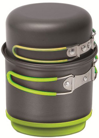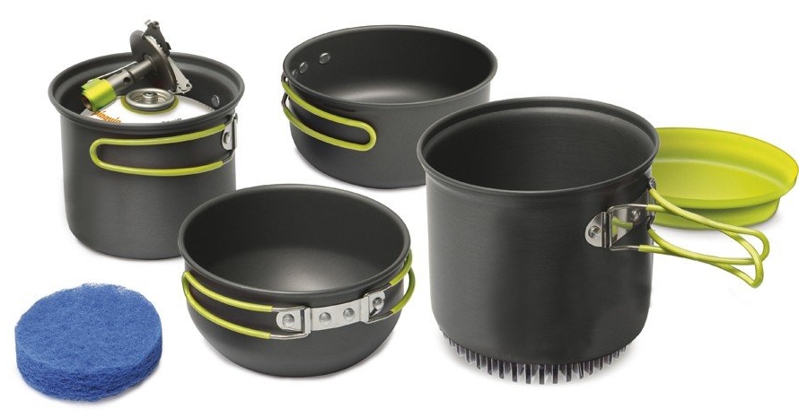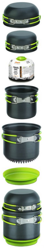 Набор алюминиевой посуды с теплообменным элементом на одной из емкостей, который позволяет экономить до 30% газа при использовании баллона. Набор состоит из 2 кастрюль, 2 крышек, 1 защитной кришки теплообменного элемента, которую можно использовать как плоскую миску и 1 губку для мытья. Поверхностный слой анодирован, что придает изделиям огнестойкость, износостойкость. Меньшая кастрюля помещается в большую. Комплект обеспечивает безопасную транспортировку газовых баллонов и маленькой горелки. Горелка и картридж не включены в комплект.