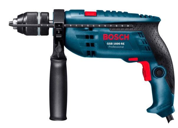 Ударная дрель Bosch GSB 1600 RE - инструмент для настоящих профессионалов. С ее помощью можно сверлить отверстия в любых материалах, таких как кирпич, бетон, камень, металлы, керамика и других синтетических материалах. Регулирование количества оборотов осуществляется колесиком на рукоятке прибора. Предусмотрена функция реверса. Точное начало сверления обеспечивается электронным регулированием частоты.