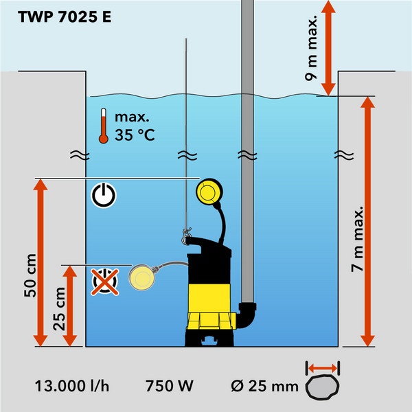 Прочный погружной насос помещен в герметичный корпус из ударопрочного пластика и подходит для работы под водой на глубине до 7 метров. Насос может начать работу с минимальной рабочей глубины 115 мм. После включения устройство откачивает отработанную воду до достижения остаточного уровня воды 35 мм. Помимо забора воды для работы системы полива сада, удаления воды после затопления и других областей применения, связанных с загрязненной водой, TWP 7025 E также подходит для транспортировки чистой воды.