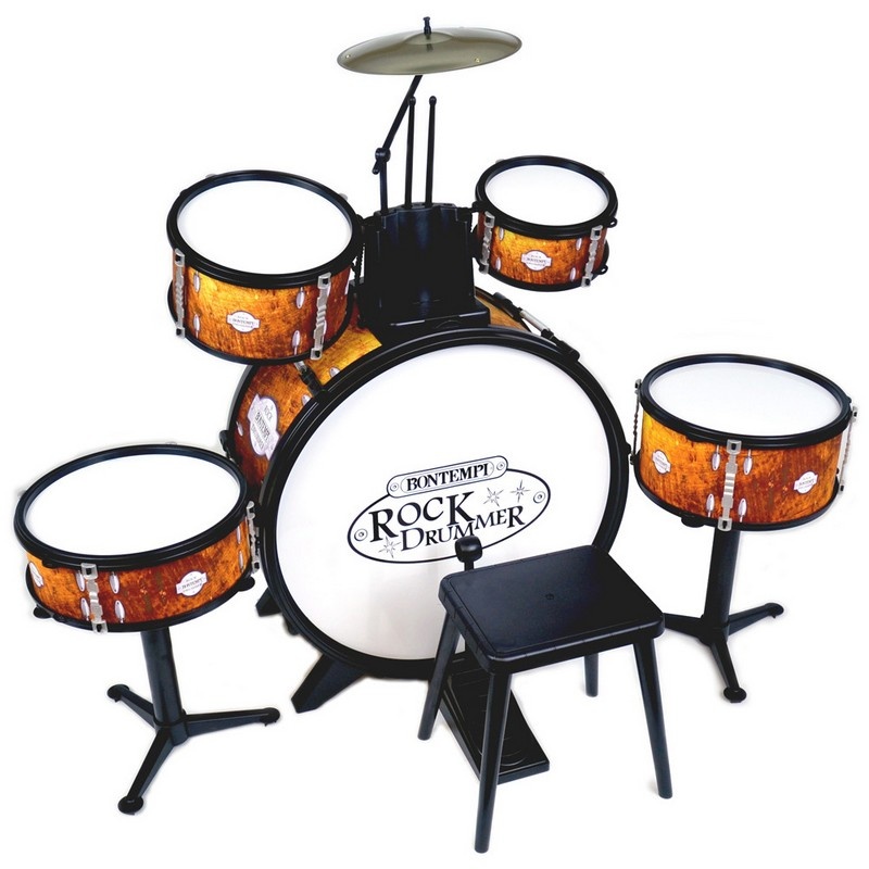 Есть ли в доме будущее Ринго? Эта рок-барабанная установка от Bontempi выглядит как настоящая рок-н-ролльная барабанная установка. Он включает в себя большой бас-барабан с ножной педалью, 2 малых барабана и тарелку. Стул и голени также включены.