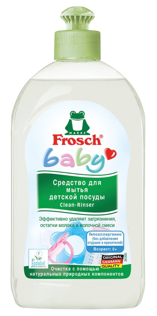 Натуральный бальзам для мытья детской посуды Frosch Baby специально разработан для потребностей молодых мам: нежное и в тоже время эффективное удаление остатков молока, каши и другой пищи с детских принадлежностей, например, детских бутылочек, сосок, прорезывателей для зубов или моющихся игрушек. Кроме этого, средство для мытья детской посуды Frosch — гипоаллергенное, не содержащее красителей и ароматических веществ и идеально подходящее для чувствительной кожи. Его нежная формула полностью смывается водой и абсолютно безопасна для детей.