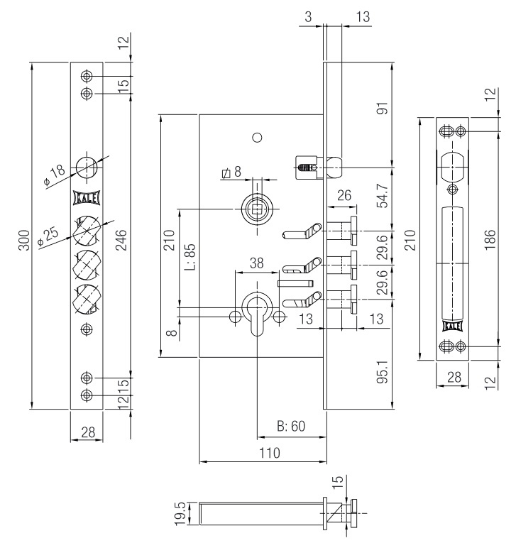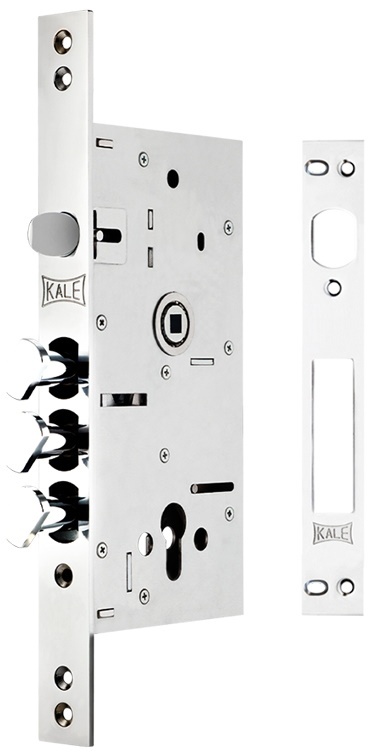 Замок врезной цилиндровый Kale-kilit (Кале-килит) 282 RD с верхней реверсивной защелкой и поворотными противоотжимными ригелями. Рекомендован для установки в деревянные и металлические двери. Удаление ключевого отверстия 60 мм. Межосевое расстояние 85 мм. Ход ригелей 26 мм.Цвет лицевой планки никель. В замок может быть установлен цилиндр европейского стандарта и ручки. Цилиндр и ручки в комплект не входят. Конструктивной особенностью данной модели являются особые противоотжимные ригели. На конце каждого их них находится специальная пластина. При полном выходе ригелей пластины поворачиваются и фиксируют ригели в ответной части. Это позволяет противостоять вскрытию замки при помощи отжима двери.
