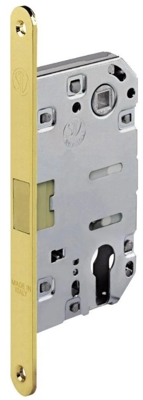 Бесшумный корпус дверного замка с магнитной защелкой предназначенный для распашных межкомнатных дверей. Вариант запирания: под цилиндр (PZ). Межцентровое расстояние (между ручкой и клучом) — 85 мм. Подходит как для правосторонних, так и для левосторонних межкомнатных дверей, как для полотен с наплывом, так и без наплыва, подходит для крепления со стандартными (DIN) европейскими ручками. Даже когда защелка заблокирована ключом, ручка вращается свободно, исключая случайную поломку замка. Регулируемая запорная планка. Тестировано 500 000 циклов открываний и закрываний по стандарту UNI 9173:88.