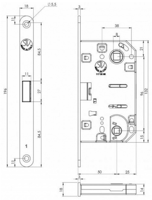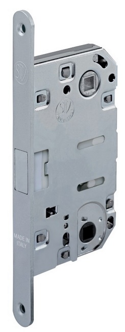 Бесшумный корпус дверного замка с магнитной защелкой предназначенный для распашных межкомнатных дверей. Вариант запирания: под завертку для санузла (WC). Межцентровое расстояние (между ручкой и заверткой) — 96 мм. Подходит как для правосторонних, так и для левосторонних межкомнатных дверей, как для полотен с наплывом, так и без наплыва, подходит для крепления со стандартными (DIN) европейскими ручками. Даже когда защелка заблокирована ключом, ручка вращается свободно, исключая случайную поломку замка. Регулируемая запорная планка. Тестировано 500 000 циклов открываний и закрываний по стандарту UNI 9173:88.
