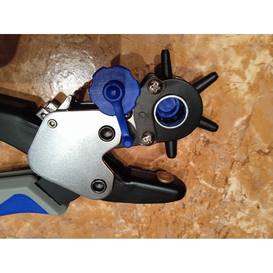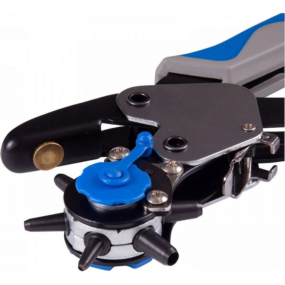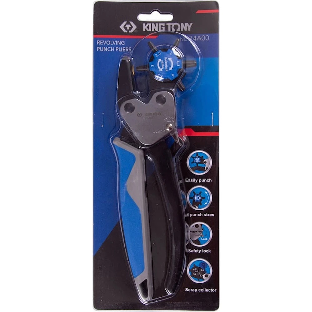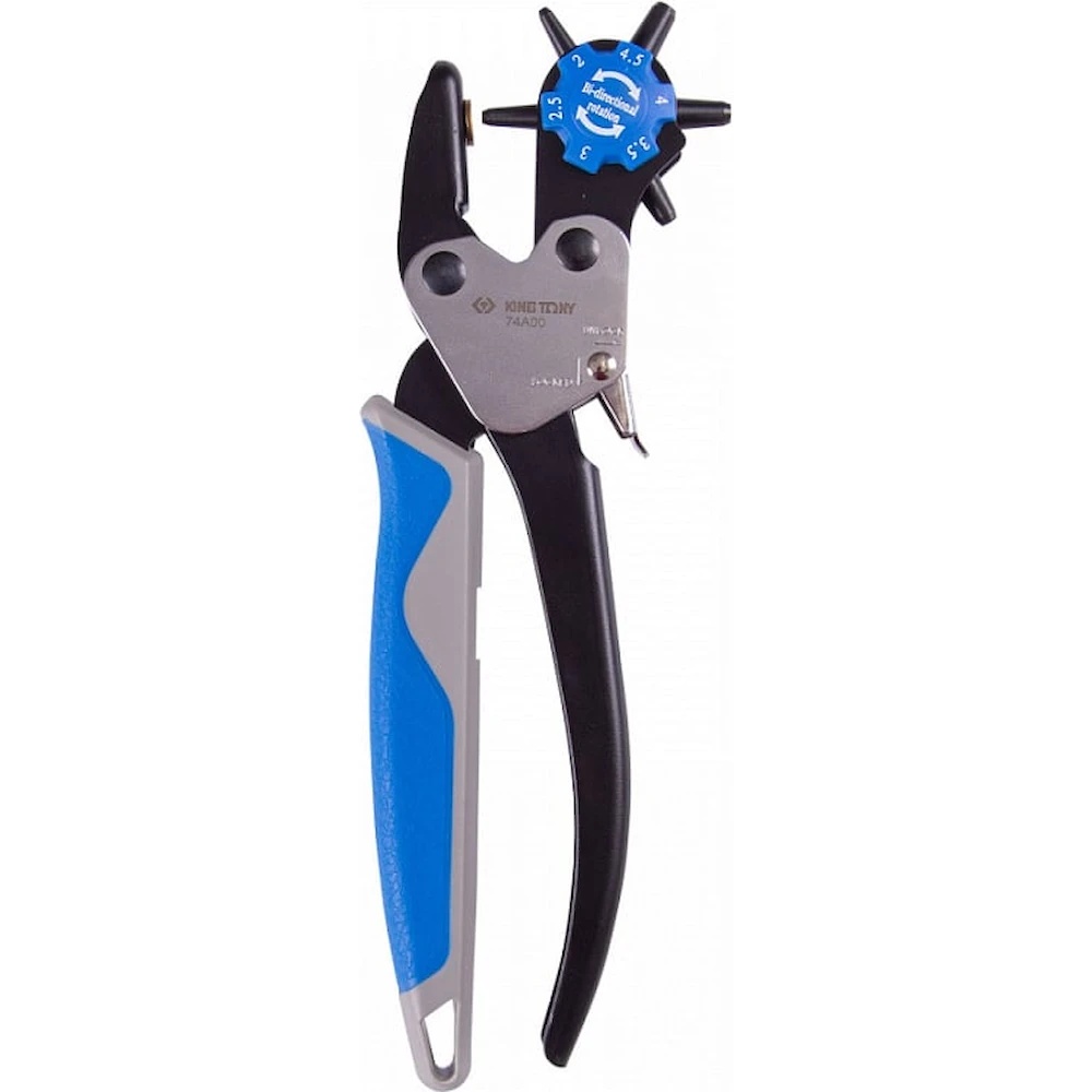 Револьверный дырокол KING TONY 2-4.5 мм, 230 мм 74A00 используется для пробивки отверстий в коже, картоне, ткани и других мягких материалах. Может применяться на станциях технического обслуживания (СТО), в автосервисах, автомастерских, производствах и в бытовой сфере. 6-позиционная головка револьверного типа позволяет легко настроить необходимый размер пробивного отверстия. Система сбора отходов облегчает использование инструмента. Клавиша блокировки обеспечивает безопасную работу. Размеры пробивных отверстий – Ø 2, 2.5, 3, 3.5, 4, 4.5 мм.
