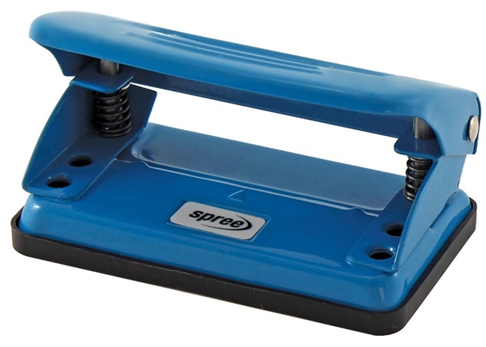 Дырокол Spree. Корпус выполнен из качественного ударопрочного ABS-пластика двух цветов. Все основные и рабочие механизмы — металлические. Пробивная мощность до 10 листов. Диаметр отверстия небольшой, всего 6 мм, расстояние между пробитыми отверстиями 80 мм. Для удобства дырокол оснащен выдвижной ограничительной линейкой с точной шкалой форматов бумаги. Съемный резервуар для конфетти. Прорезиненная подошва, которая предотвращает скольжение дырокола по поверхности. Корпус серо-синего цвета.