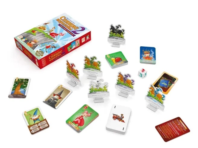 Комплектация40 числовых карт (по четыре экземпляра от 1 до 10), 12 королев, 10 королей, 10 волшебных помощников, 6 рыцарей и подставок для них, 6 Диких гномов, 5 Ведьм-менял, 5 Сонных ив, 4 Книги чар, 2 памятки хода, 1 кубик, правила игры.