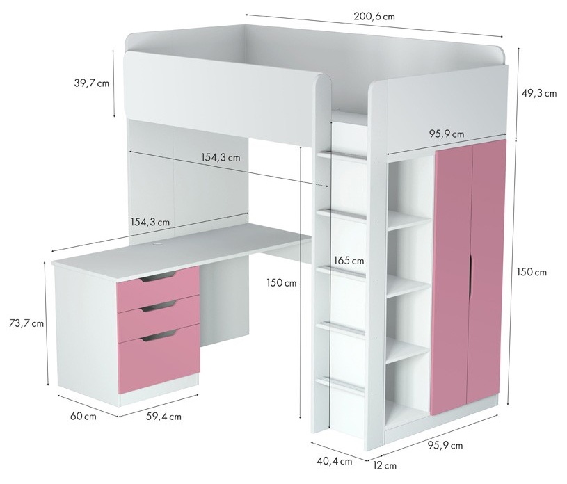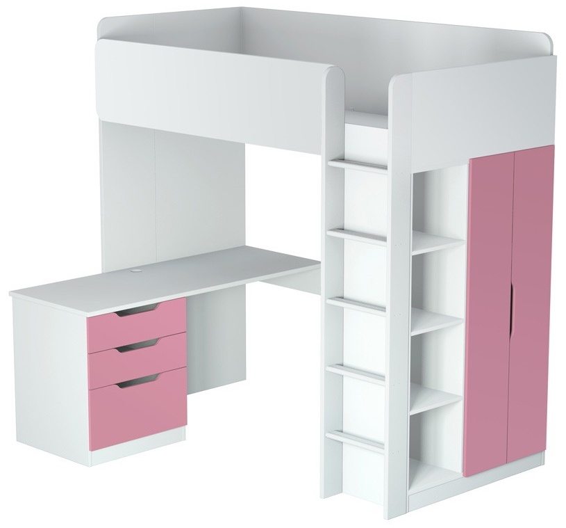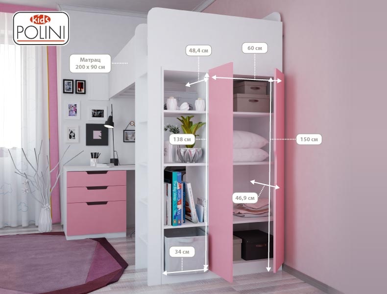 В целях обеспечения безопасности кровать - чердак Полини Симпл следует использовать детям в возрасте от 6 до 16 лет. Модель включает в себя все самое необходимое для полноценной жизнедеятельности: подростковую кровать, стеллаж, шкаф, стол, тумбу.