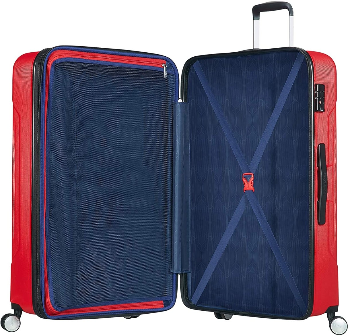 — Практичная угловатая форма чемодана позволяет положить внутрь максимальное количество вещей, а сетчатая перегородка на молнии и упругие перекрестные ремни обеспечат их компактную укладку.